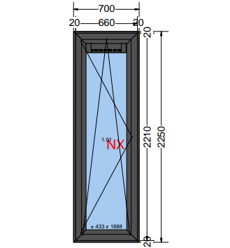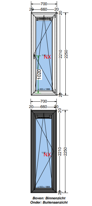 Kunststof raam van 700mm breed bij 2250mm hoog. Uitgevoerd in antractiet houtnerf met witte binnenzijde. Inclusief hor. Voor details, zie tekening.