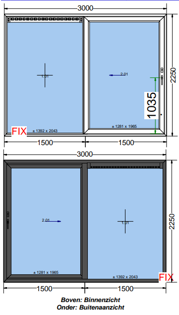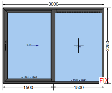 Kunststof schuifpui van 3000mm breed bij 2250mm hoog. Uitgevoerd in antractiet houtnerf met witte binnenzijde. Voor details, zie tekening.