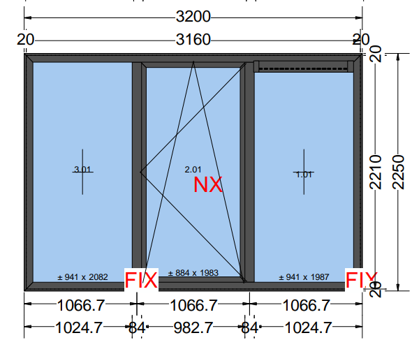 Kunststof ramen van 3200mm breed bij 2250mm hoog met draaikiepraam in het midden. Uitgevoerd in antractiet houtnerf met witte binnenzijde. Inclusief hor. Voor details, zie tekening.